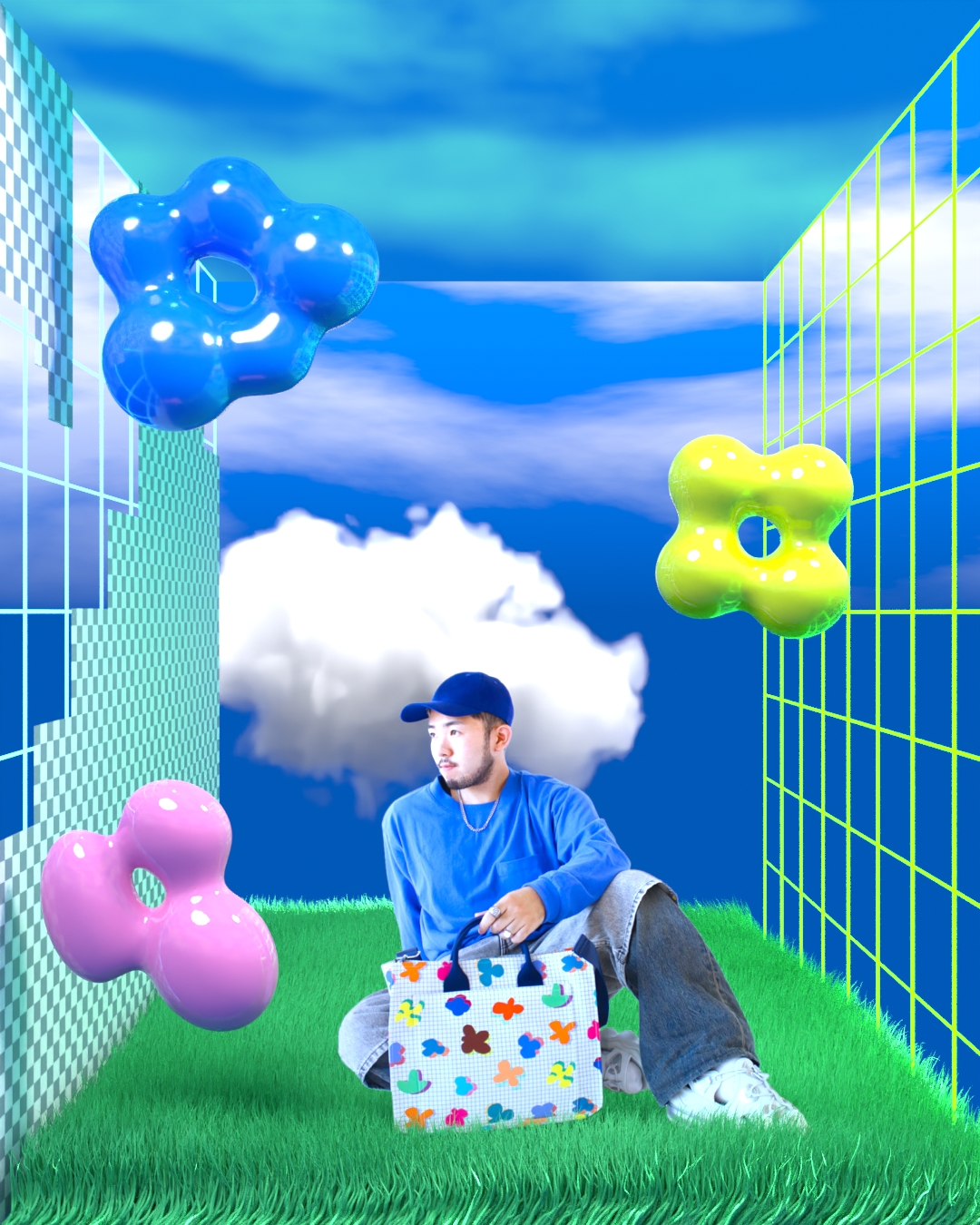 デジタル空間で生まれた花をイメージした模様。Photoshopの透過背景を使用してPC上の画面をそのまま